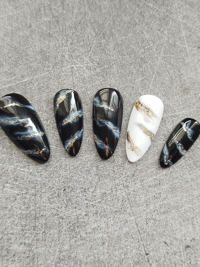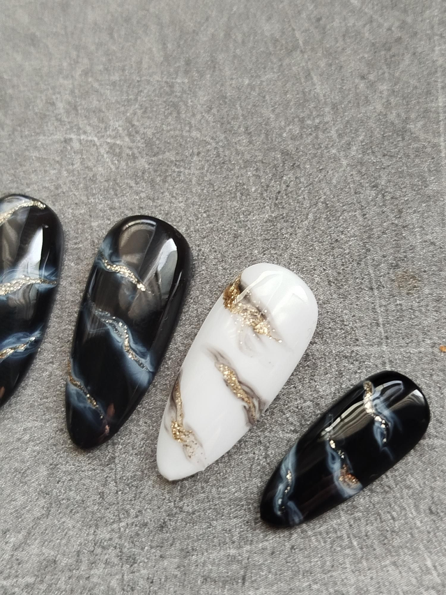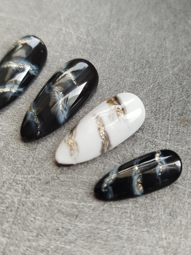 Sophistiqué et intemporel, Éclat d’Obsidienne mêle la profondeur du noir marbré à la douceur du blanc laiteux, sublimés par de fines veines dorées. Chaque ongle évoque une pierre précieuse sculptée, pour un rendu chic, moderne et luxueux.